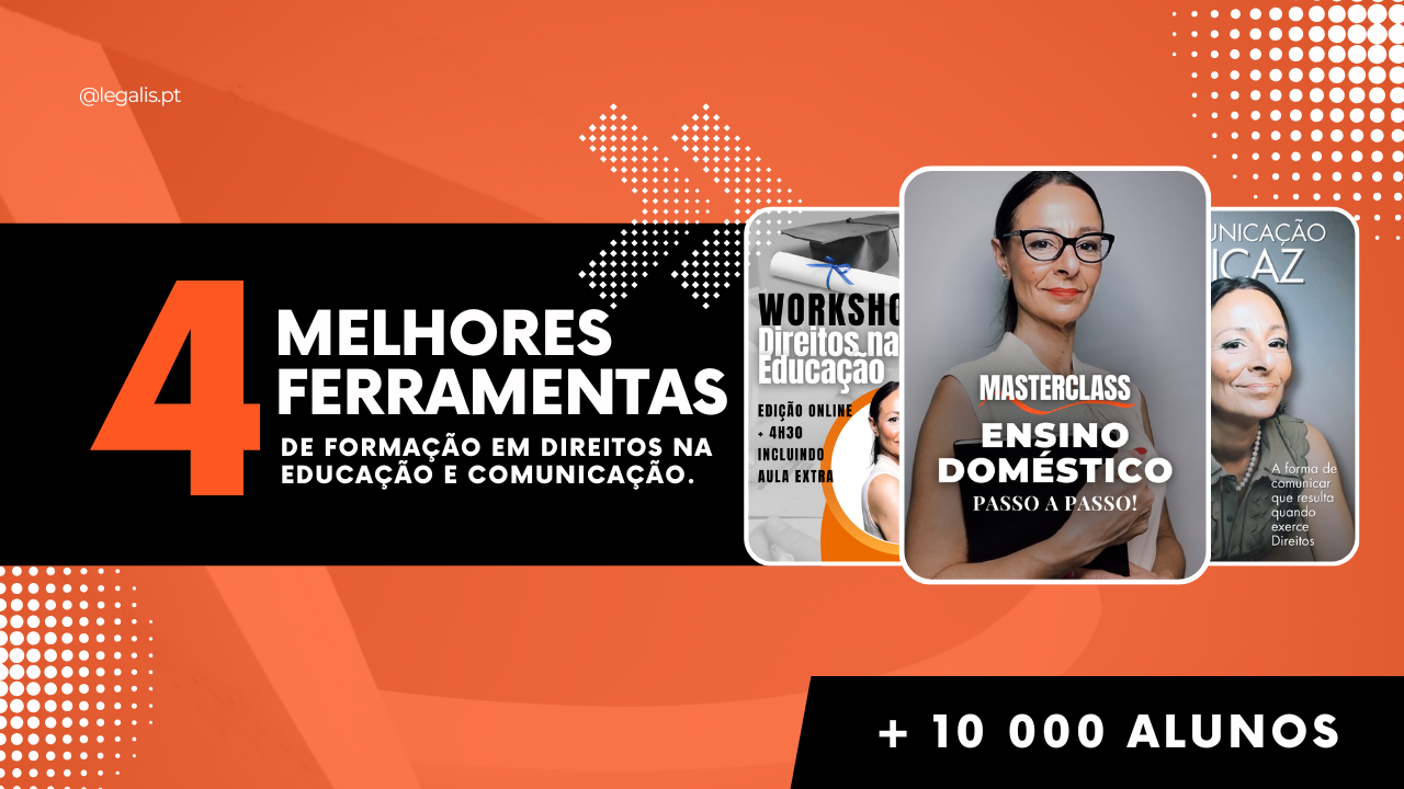 As 4 melhores ferramentas de formação em Direitos Fundamentais na EDUCAÇÃO e COMUNICAÇÃO. Workshop Direitos na Educação +4h30 de aulas sobre tudo o que importa na educação em Portugal + Masterclass Ensino Doméstico passo a passo + Webinar Comunicação e Direitos Fundamentais e ainda o eBook "Comunicação Eficaz". TUDO NO VALOR DE 268,00€ AGORA👉150,00€!!
